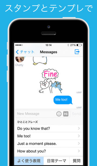 スタンプ英会話|Chatty チャットで英語を学べるチャッティー。レアジョブ英会話が提供。日常会話、スピーキング、高校・大学受験、TOEIC対策学習ができるアプリ(以下、Chatty)は、スタンプを使ってチャット英会話ができる英語学習アプリです。今なら毎日10分の無料チャットが何回でも利用できます(2014年7月14日現在)。